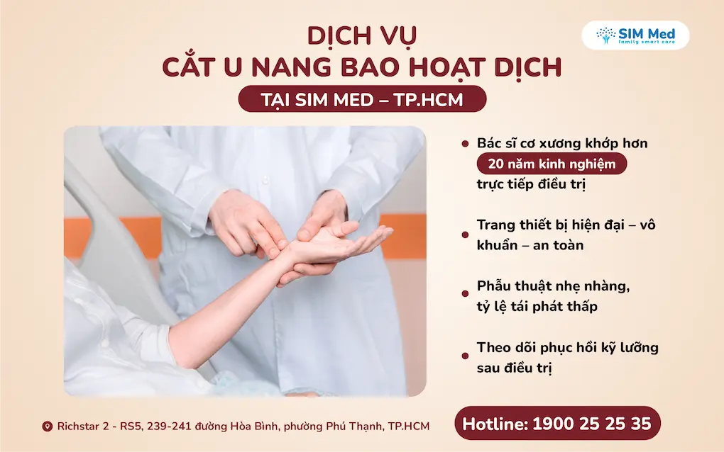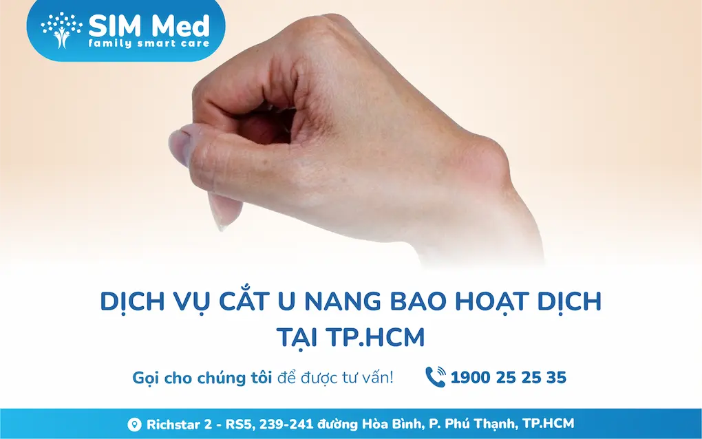 Nếu bạn đang gặp phải tình trạng u nang bao hoạt dịch gây đau nhức hoặc ảnh hưởng đến thẩm mỹ...hãy đến ngay Phòng khám Đa khoa SIM MED - địa chỉ cung cấp dịch vụ cắt u nang bao hoạt dịch tại TP.HCM. Tại đây, bệnh nhân sẽ được thăm khám kỹ lưỡng, tư vấn phác đồ phù hợp và theo dõi hồi phục cẩn thận nhằm hạn chế tối đa nguy cơ tái phát.