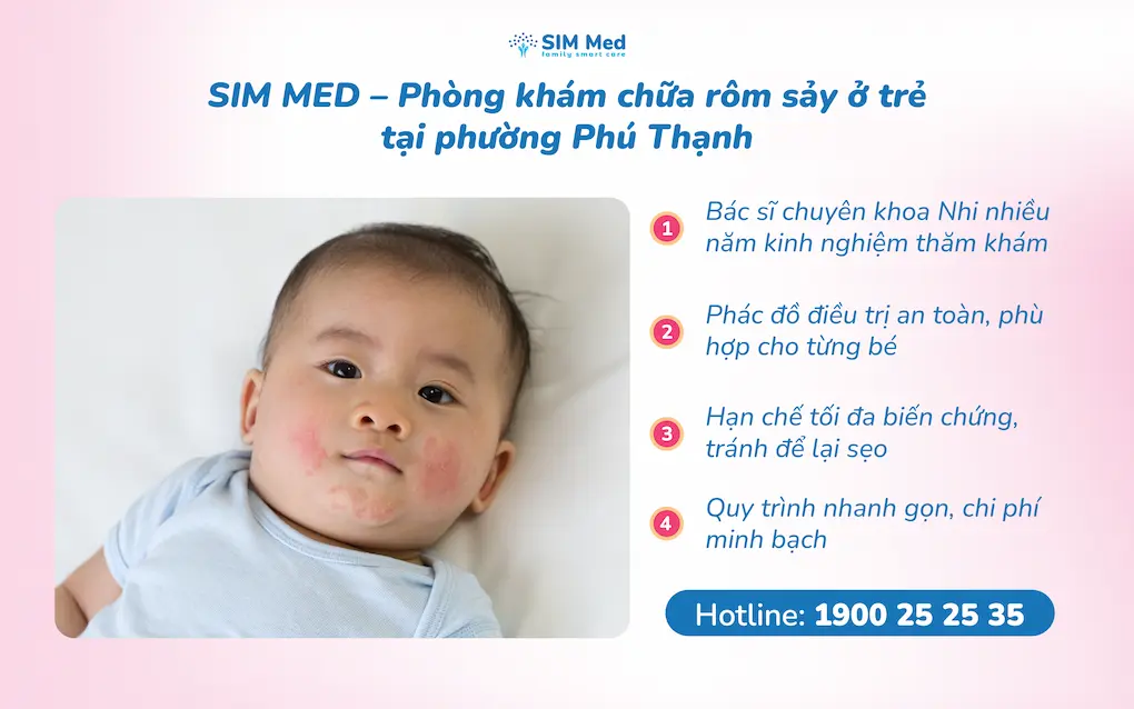 Nếu ba mẹ đang tìm kiếm phòng khám chữa rôm sảy ở trẻ tại phường Phú Thạnh, thì SIM MED chính là gợi ý không thể bỏ qua. Tại phòng khám đa khoa SIM MED, các trường hợp rôm sảy từ nhẹ đến nặng đều được thăm khám kỹ lưỡng bởi đội ngũ bác sĩ chuyên khoa Nhi có nhiều năm kinh nghiệm. Tùy thuộc vào từng tình trạng da, các bé sẽ có phác đồ điều trị phù hợp, hạn chế tối đa nguy cơ nhiễm trùng da, để lại sẹo hoặc tái phát rôm sảy sau đó.