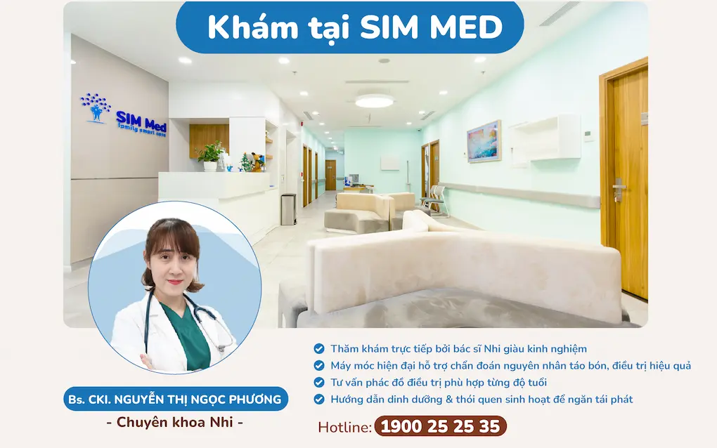Khi trẻ gặp phải tình trạng táo bón, việc lựa chọn một địa chỉ thăm khám uy tín, có đội ngũ bác sĩ giàu kinh nghiệm và phương pháp điều trị phù hợp là vô cùng quan trọng. Nếu bố mẹ đang tìm kiếm một phòng khám táo bón ở trẻ tại phường Phú Thạnh? Hãy đến ngay SIM MED - địa chỉ đáng tin cậy đồng hành cùng bé trên chặng đường cải thiện sức khỏe đường ruột.