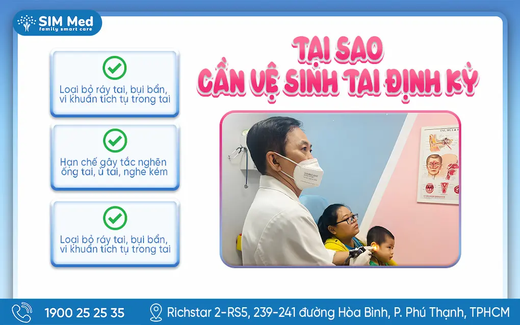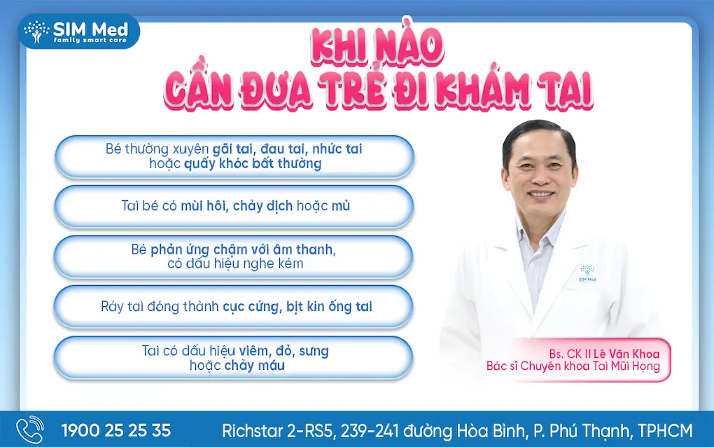 Bên cạnh đó, khi bé có dấu hiệu như chảy dịch tai, đau tai, ngứa tai hoặc nghi ngờ viêm tai giữa, các bác sĩ tại SIM MED sẽ tiến hành thăm khám kỹ lưỡng và đưa ra phác đồ điều trị phù hợp, an toàn. Việc được theo dõi bởi bác sĩ chuyên môn ngay từ đầu giúp hạn chế biến chứng và bảo vệ tốt nhất thính lực của trẻ.
