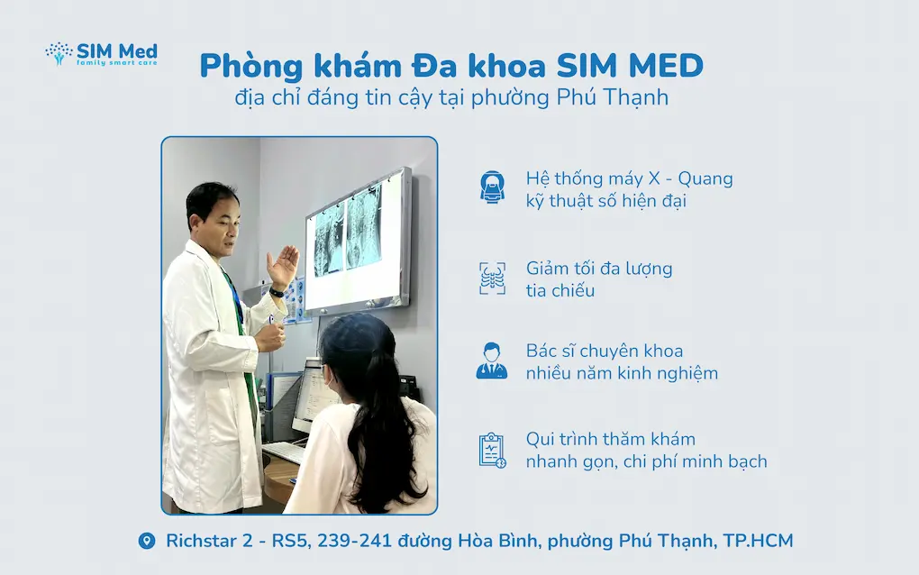 Mọi dịch vụ đều được Phòng khám Đa khoa SIM MED niêm yết công khai, minh bạch, phù hợp với nhiều đối tượng bệnh nhân. Không gian khang trang, sạch sẽ, mang lại sự thoải mái và yên tâm cho bệnh nhân trong suốt quá trình thăm khám. Nếu quý khách hàng muốn trải nghiệm dịch vụ chụp X - Quang tại phường Phú Thạnh, vui lòng liên hệ hotline 1900 25 25 35 để được đội ngũ SIM MED tư vấn và hỗ trợ đặt lịch ngay hôm nay nhé!